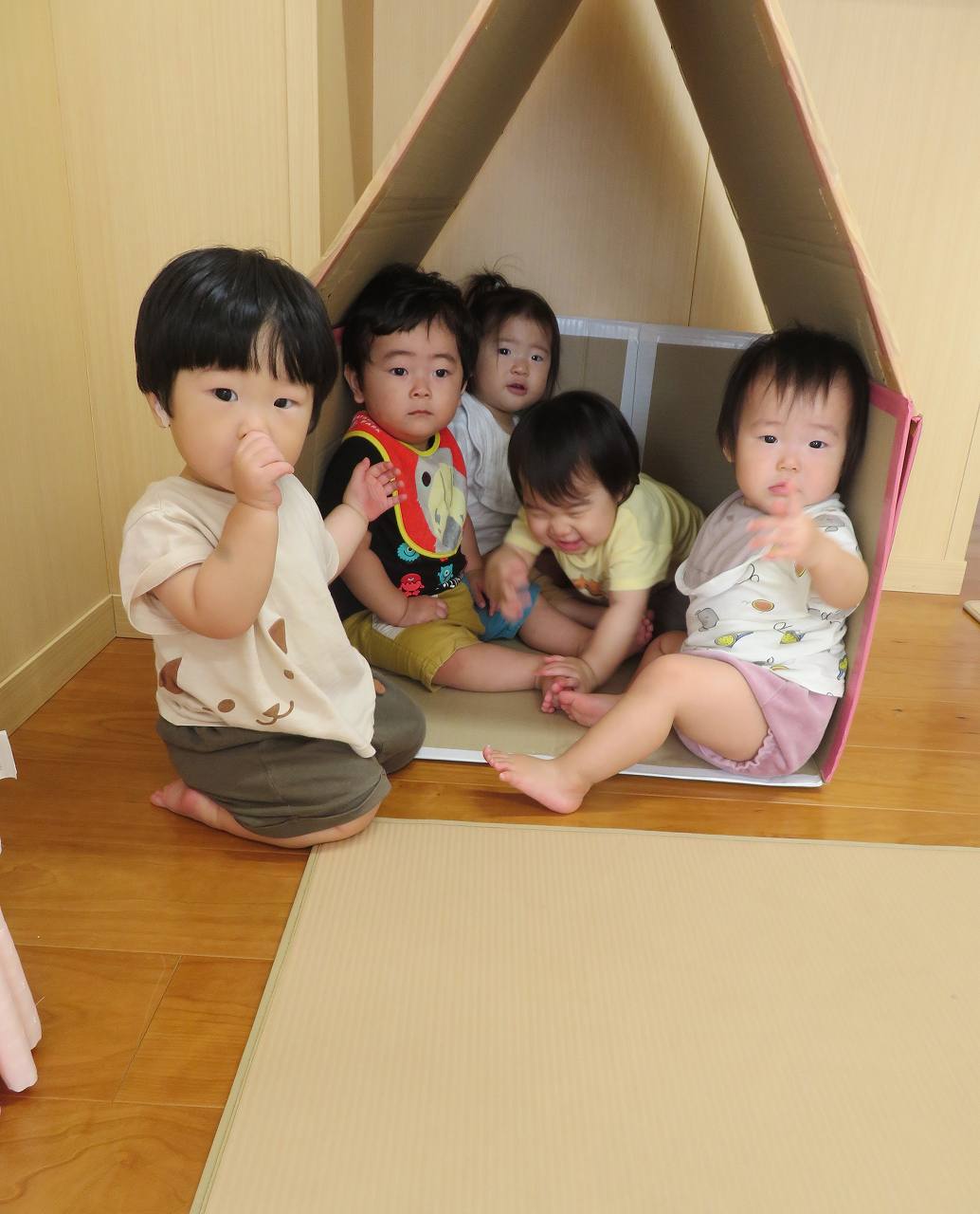 段ボールの折りたたみハウスを出すと・・・一人二人入って、小さなお家の中で、笑い合って遊んでいます。