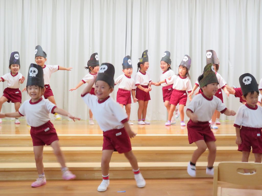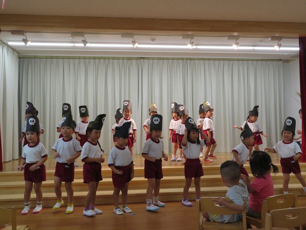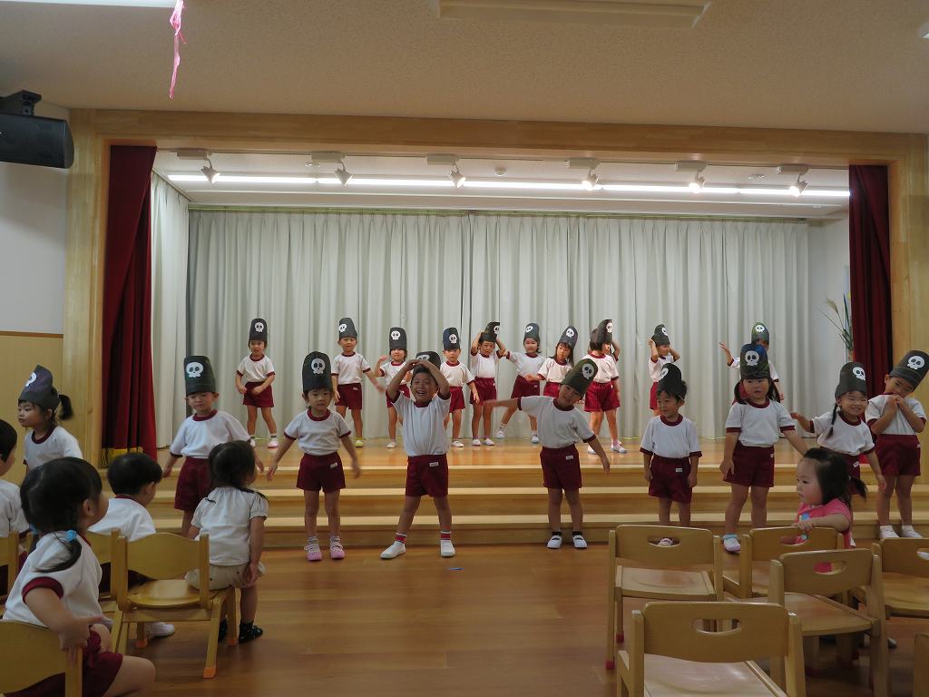 運動会でしようと思っている、ひょっこりさくら島の海賊さくら団に扮して恰好いい海賊の帽子を作って踊って見せてくれました。
