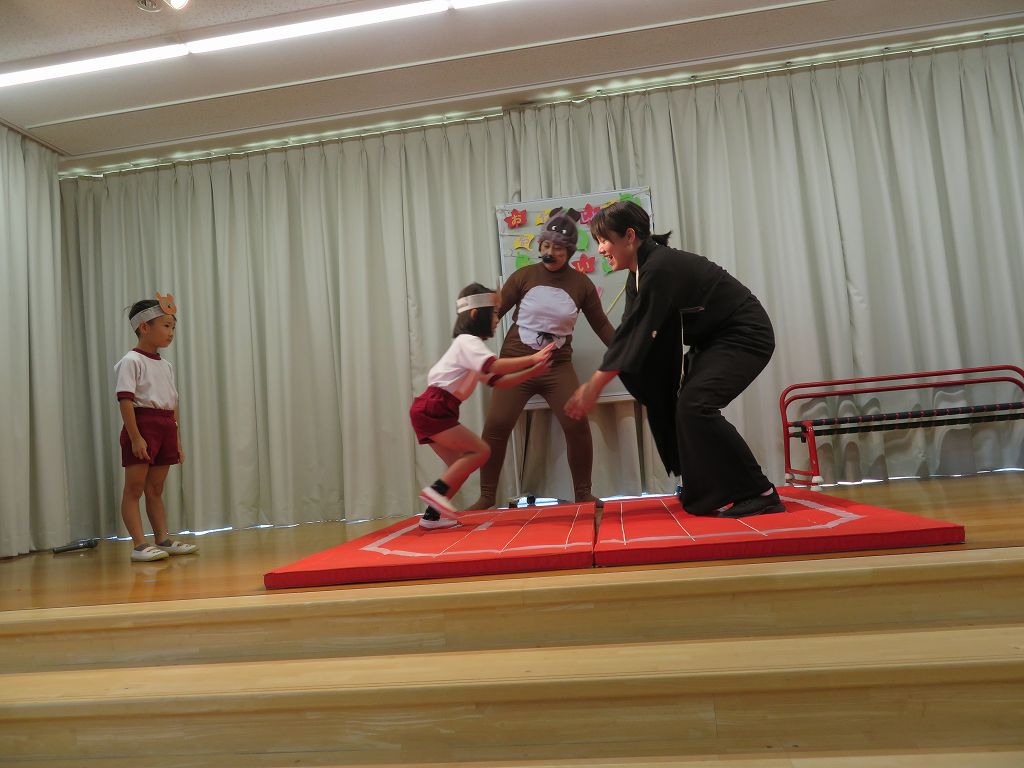 和尚さんとお相撲をして勝ったらお寺を借りれると言われ10月生まれの可愛い狸さんたちはお相撲をとりました。