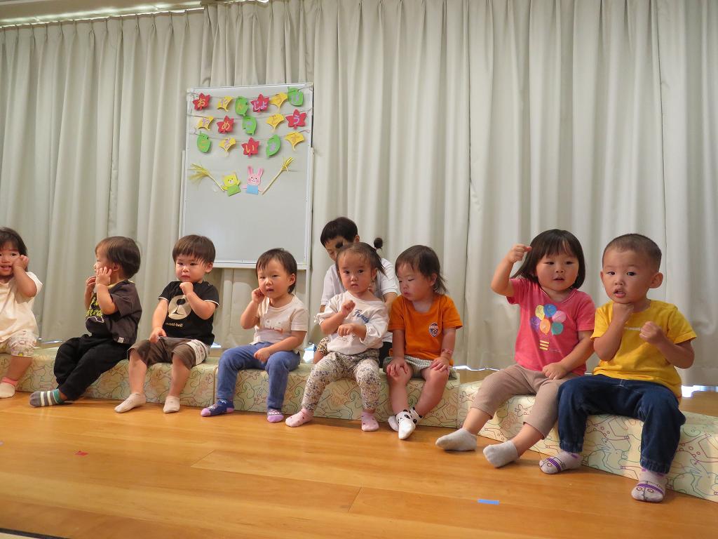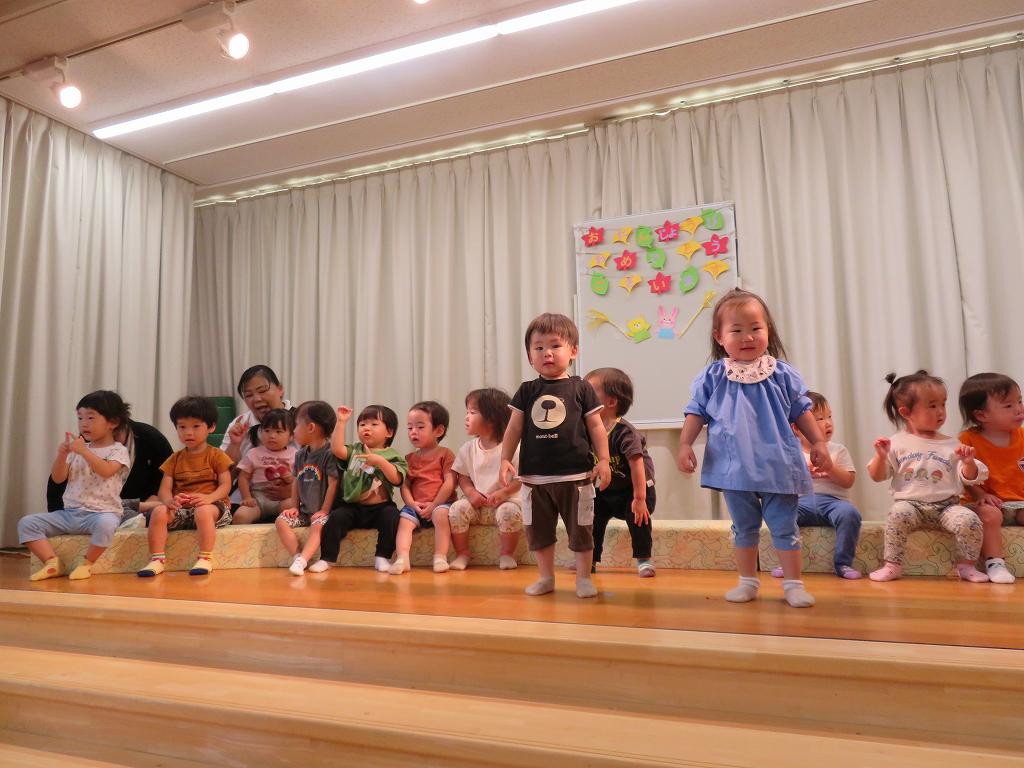 日頃お部屋で遊んでいる手あそびや歌を舞台に出てきてくれて披露してくれました。
