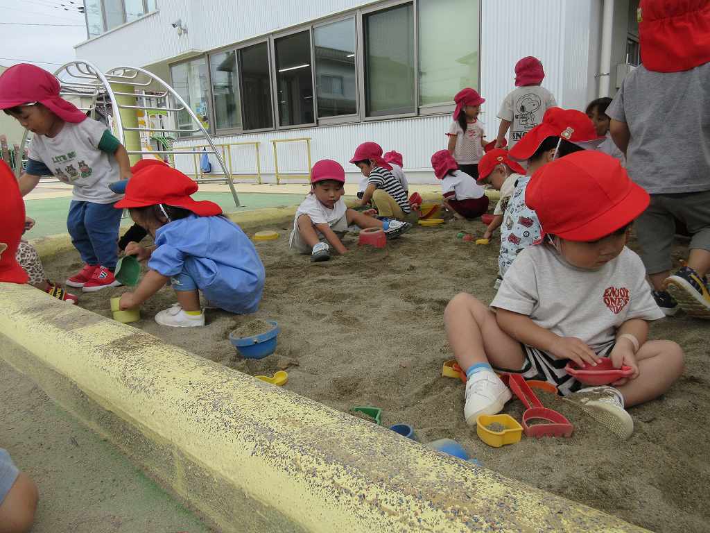 砂場では、もも組さんと一緒に遊びました。