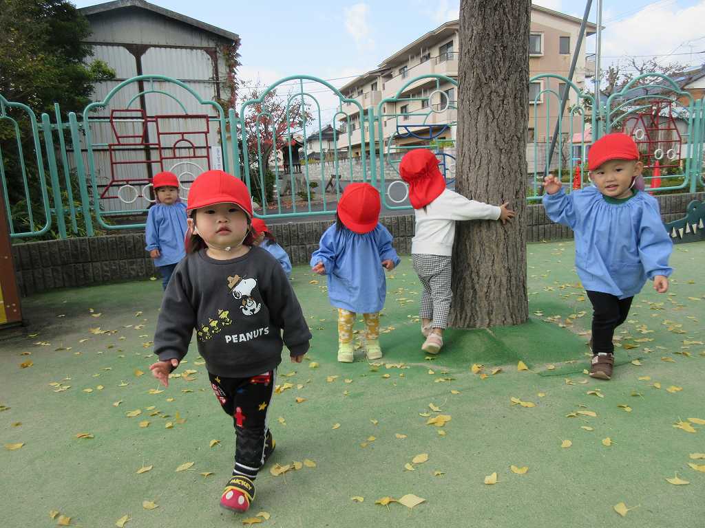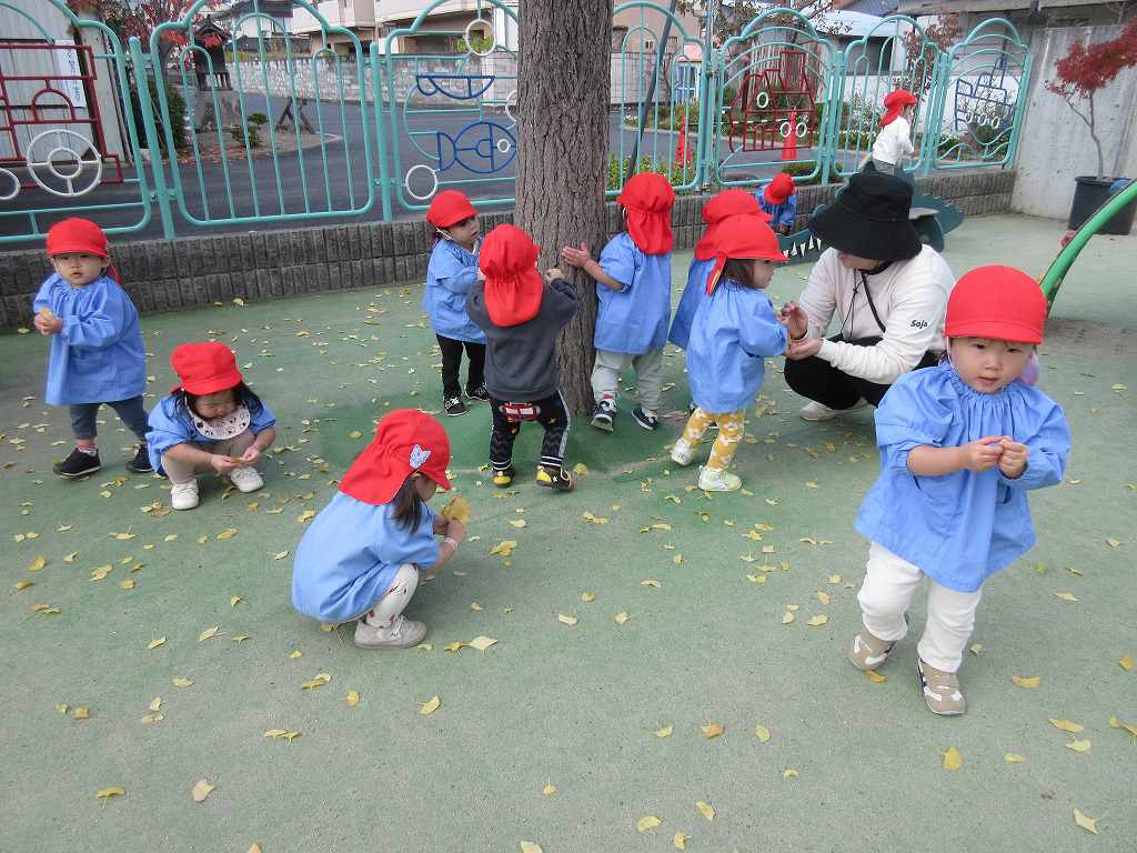 イチョウの木が黄色に色づき、たくさん落ちていました。イチョウの葉っぱを拾い、クルクル回したり集めて葉っぱの束を作っていました。今ちょうど紅葉が見頃ですね。