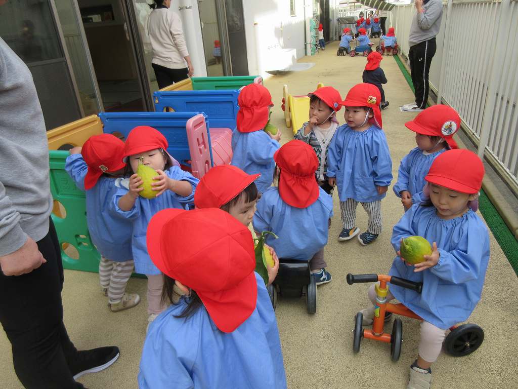 保育園で育った大きなレモンを園長先生が見せてくれました。