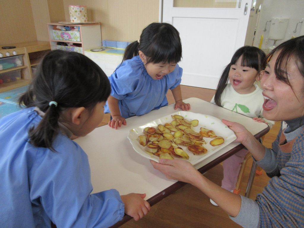 「ほんとのお芋になったらいいな~と思っておまじないをしてたんだよ」と言うと純粋な子どもたちは「すごーい!」と大喜び♫普段お芋が苦手なお友だちも「おかわりくださーい!」とおいしそうに食べてくれて嬉しかったです♪