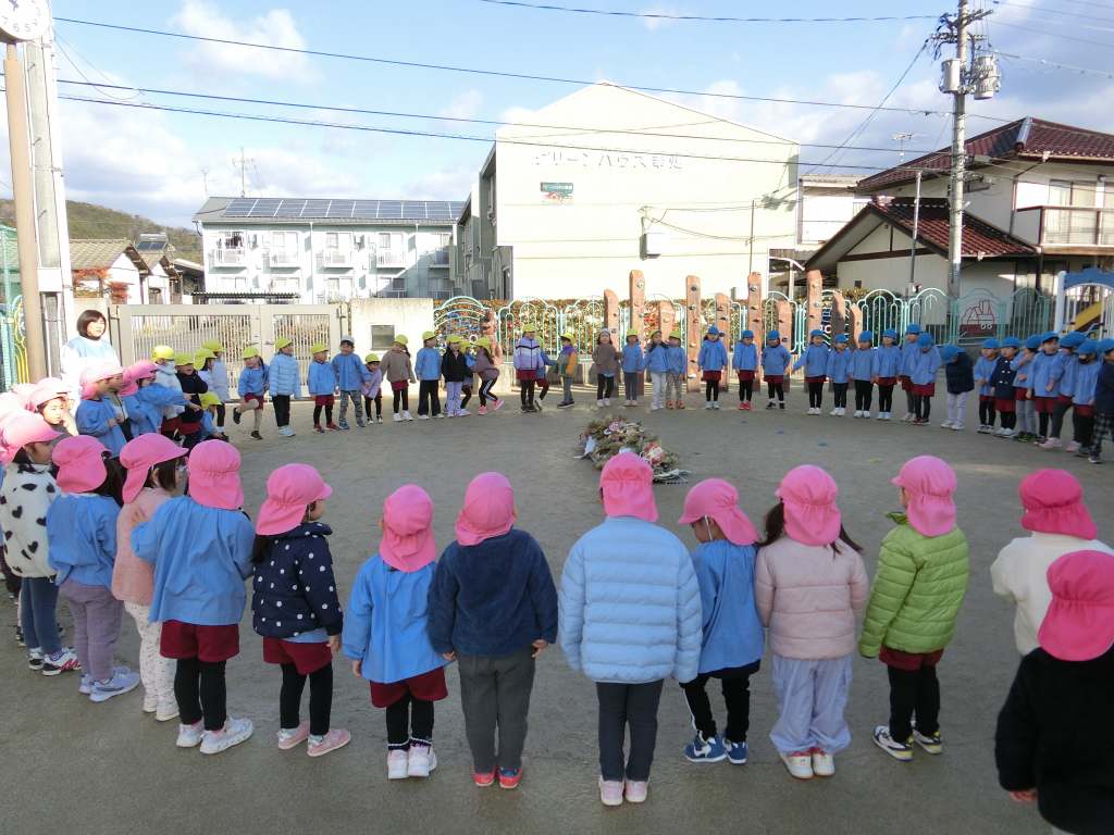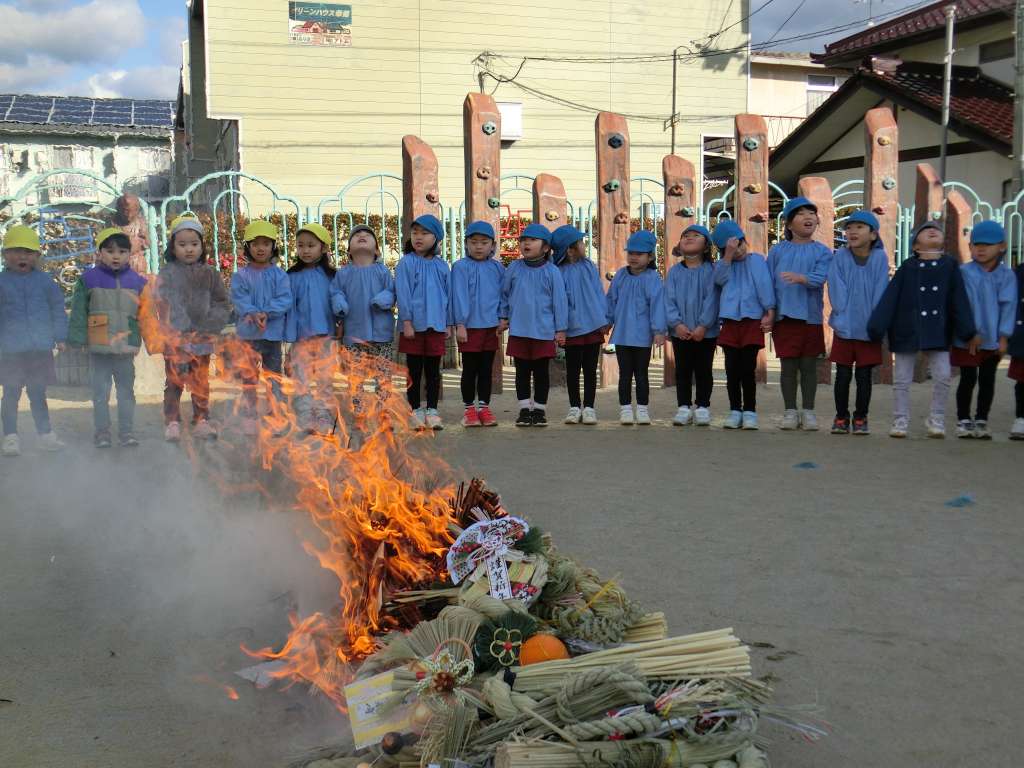 寒い朝でしたが、みんなで園庭にあつまりとんど焼きをしました。