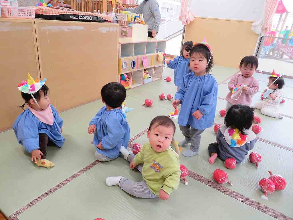先日作った鬼の製作を頭につけて節分に参加しました。