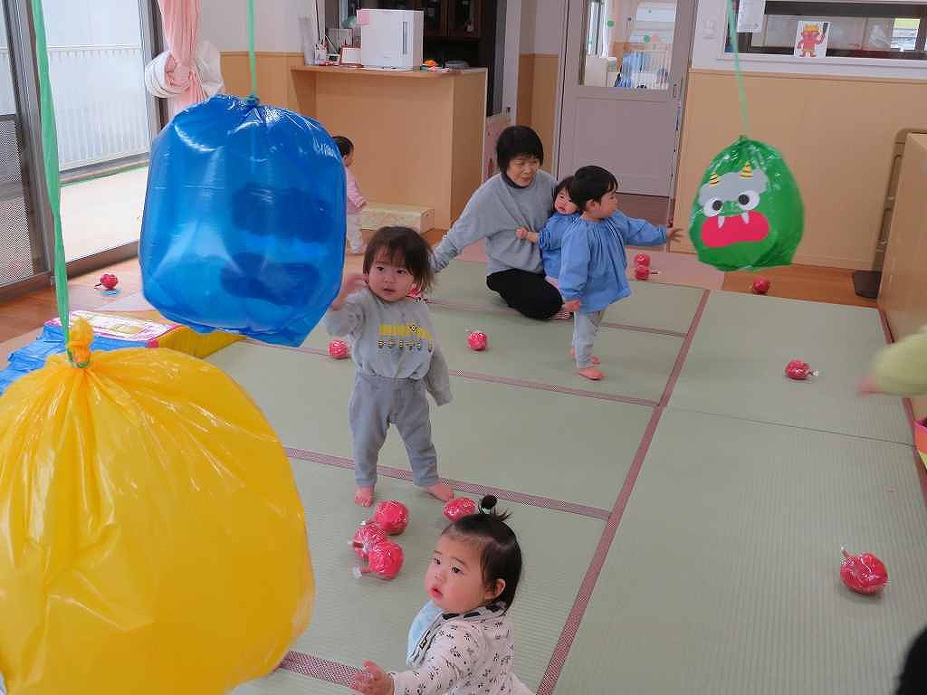 ビニール袋の鬼を天井からぶら下げると、パンチしたりりんごを投げていました。