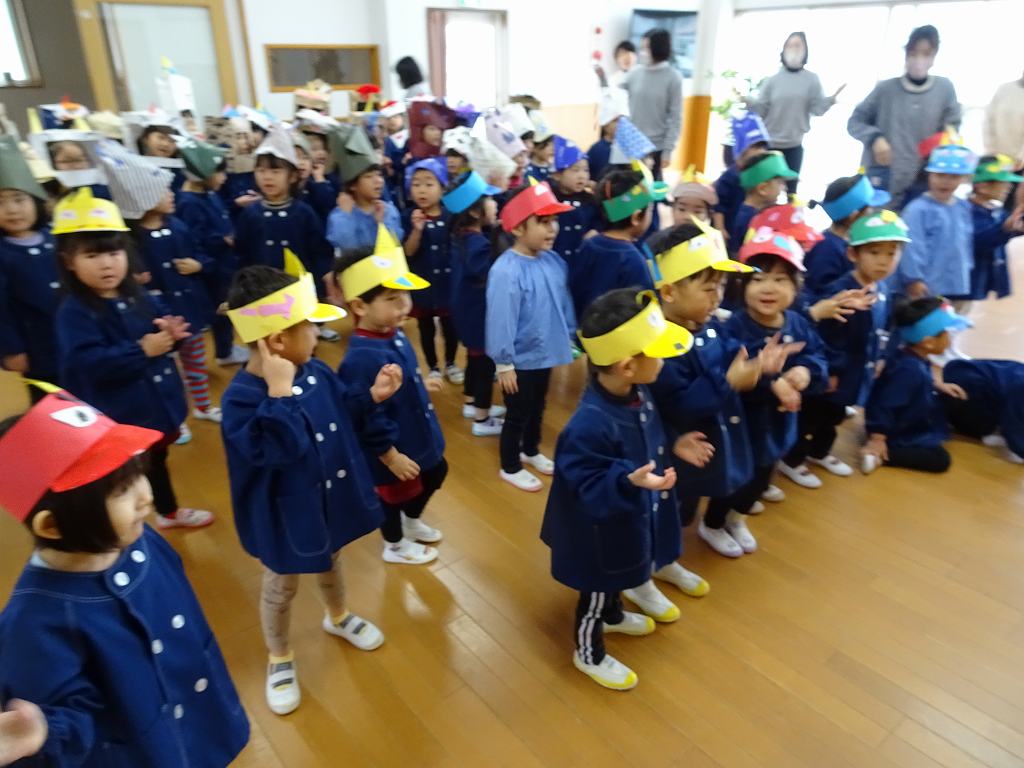 今日は節分。 ゆり、うめ、さくら組が集まって豆まきをしました。