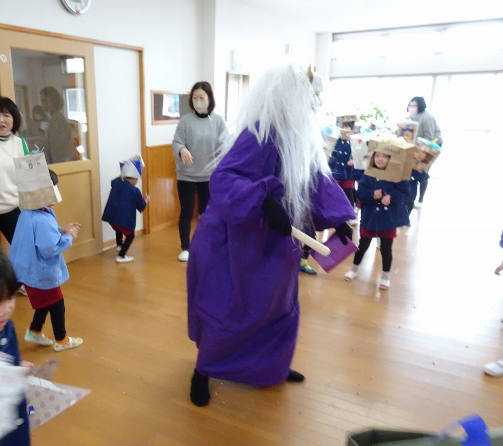 鬼の登場に驚きながらも「鬼は外!!」と精いっぱい声を出して豆を投げました。