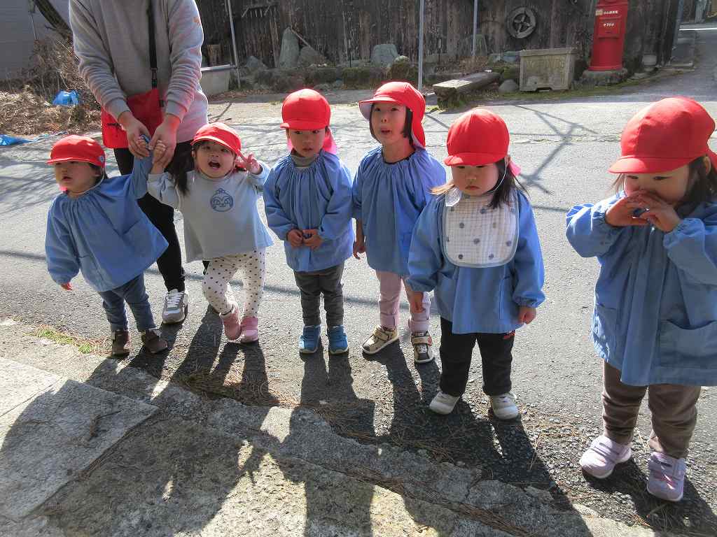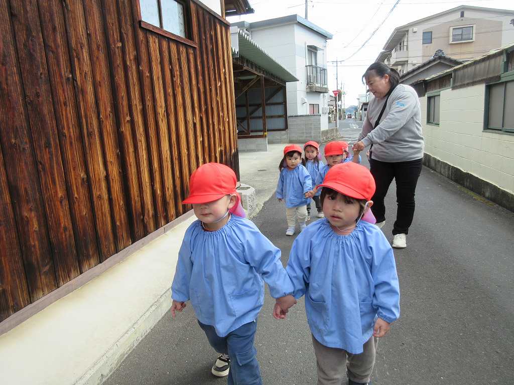 3グループに分かれてお友だちと手をつなぎ、歩きました。