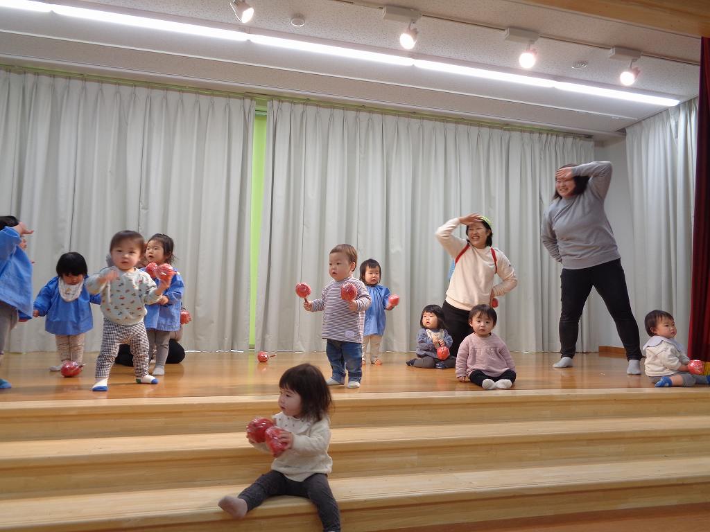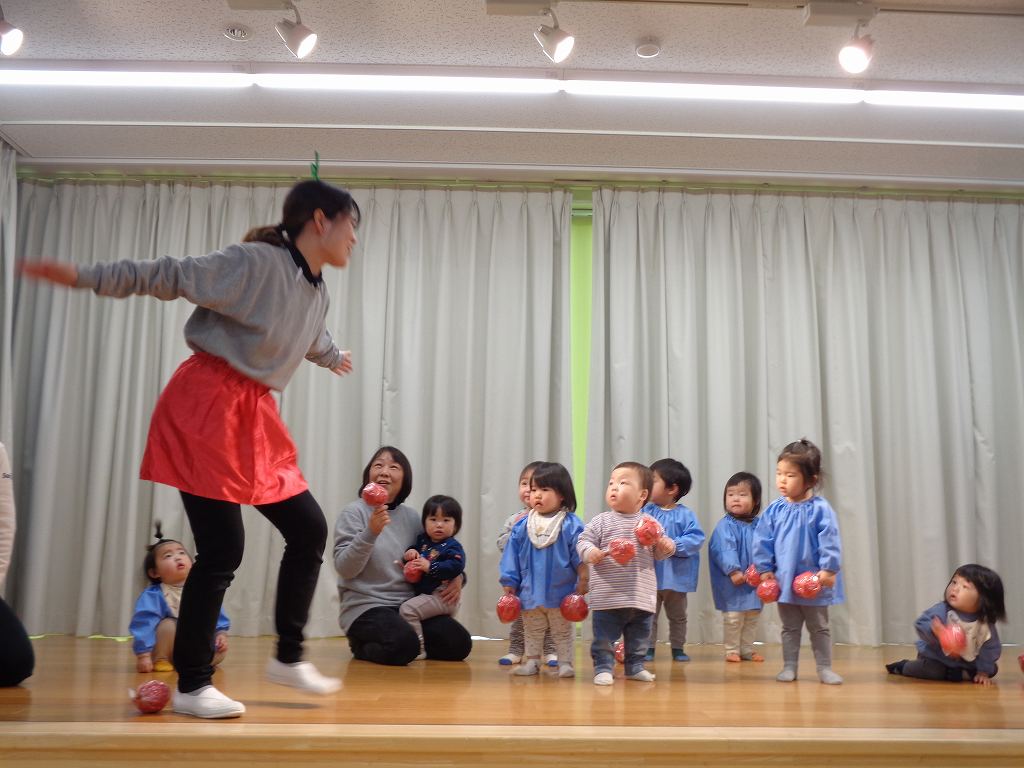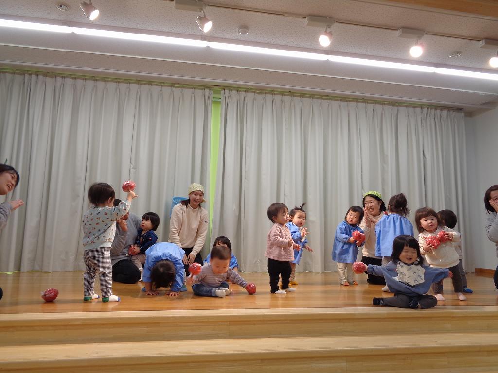 生活発表会でリンゴ狩りごっこをしましたが、その時のBGM「ごめんねりんご」の曲が大好きになり毎日のように踊っていたので、誕生会でみんなに見てもらいました。