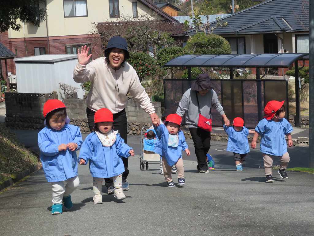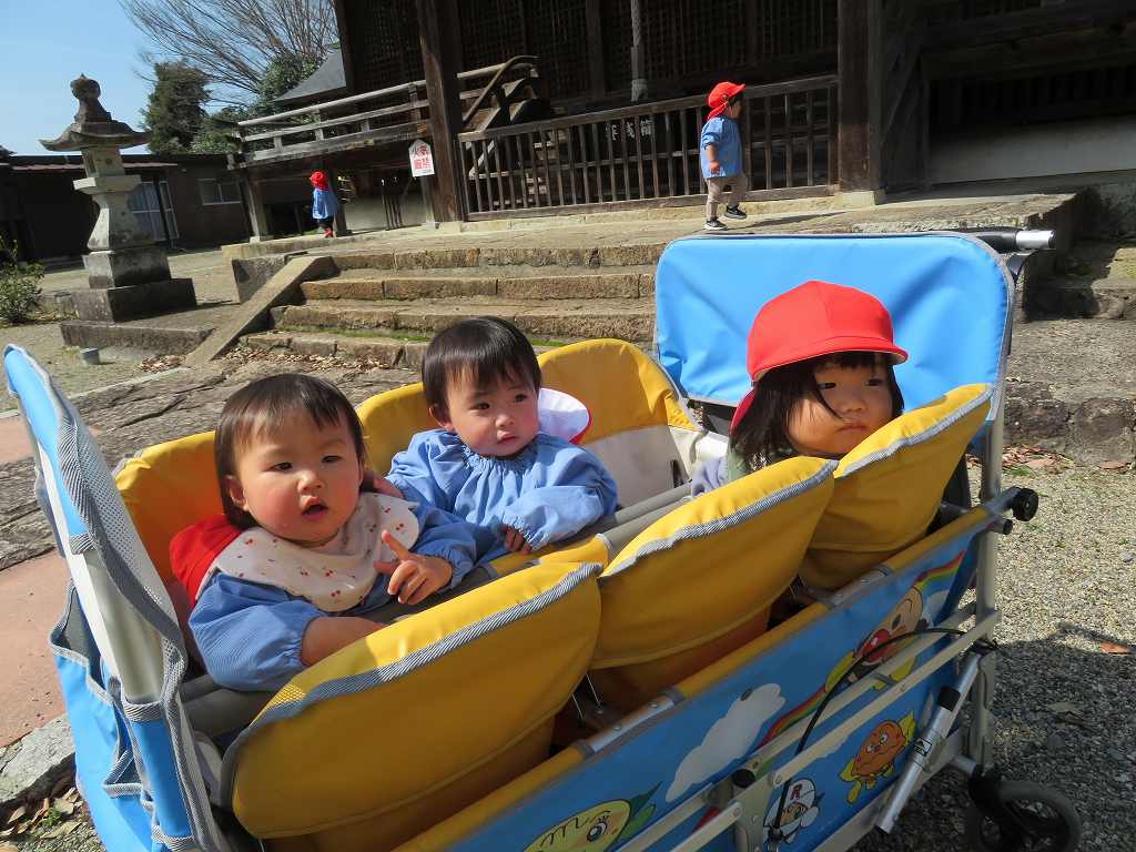 途中でちょうちょうを見つけ散歩車の中から指さしたり、保育者と手を繋いで歩きました。